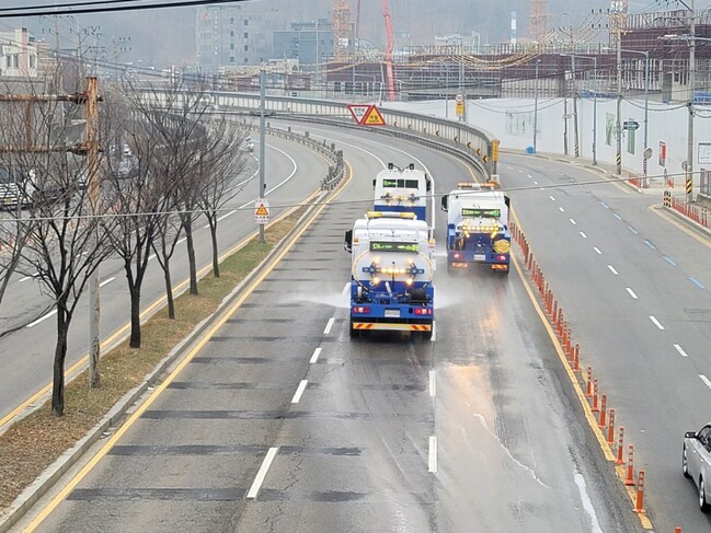 미세먼지 비상저감조치가 내려진 지난 11일부터 살수 차량 두 대와 미세먼지흡입차량, 진공청소차량 등 청소차량 7대의 운행 횟수를 늘려 풀가동하는 중이다.