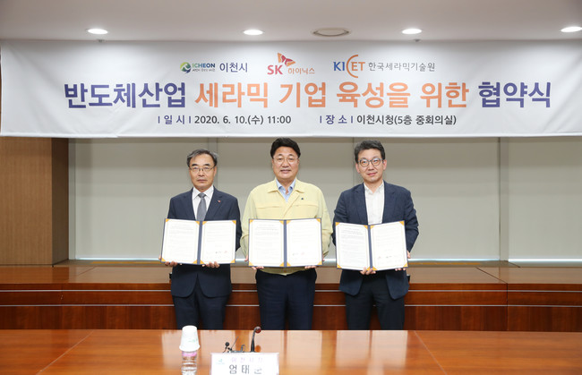 10일 엄태준 이천시장, 박용근 SK하이닉스 부사장, 유광수 한국세라믹기술원장 등이 참석한 가운데 반도체 관련 세라믹 산업 성장을 위한 공동협력 양해각서(MOU)를 체결하였다고 밝혔다.