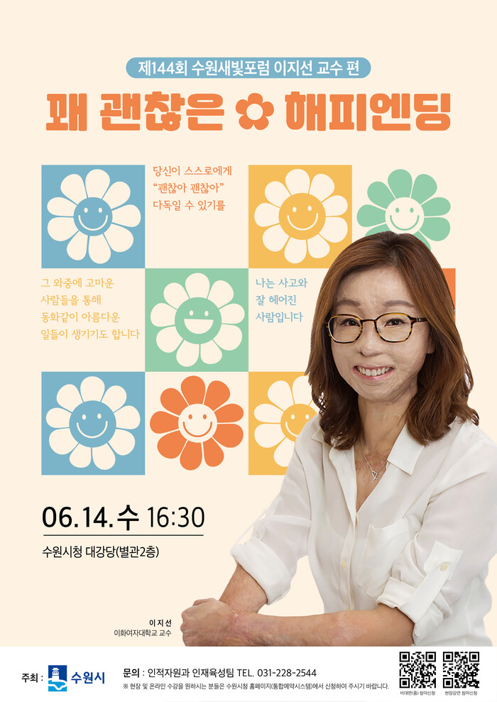 수원시는 6월 14일 오후 4시 30분 시청 대강당에서 ‘꽤 괜찮은 해피엔딩’을 주제로 ‘제144회 수원새빛포럼 이지선 교수 편’을 개최한다.
