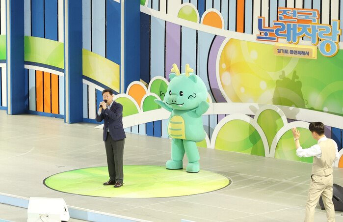 이 시장은 사회자 남희석 씨의 요청에 따라 가수 이연실 씨의 ‘목로주점’을 불렀다. 이 시장은 남희석 씨에게 용인특례시 캐릭터 ‘조아용’ 쿠션을 소개하면서 선물로 줬다.