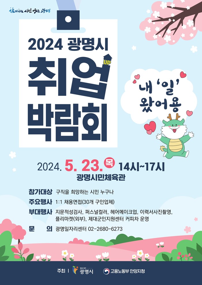 광명시(시장 박승원)는 오는 23일 오후 2시부터 5시까지 광명시민체육관에서 일자리 활성화를 위한 ‘2024년 광명시 취업박람회’를 개최한다.