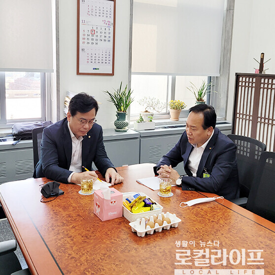 | ▲ 이권재 오산시장(오른쪽)이 송언석 국회의원(왼쪽)을 만나 지역 현안에 대한 지원을 요청하고 있다. (사진출처=이권재 페이스북) |