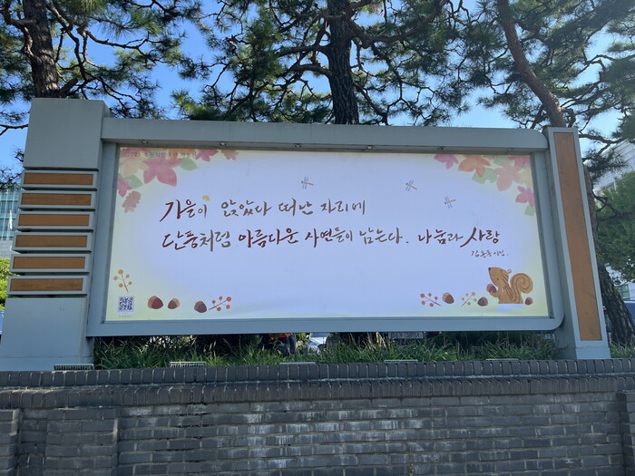 가을편 문안은 수원에서 태어나 시인·수필가·칼럼니스트 등으로 활동하는 김훈동 작가의 메시지다. 희망글판 이미지 디자인은 청년 지역작가인 박지연 작가가 맡았다.