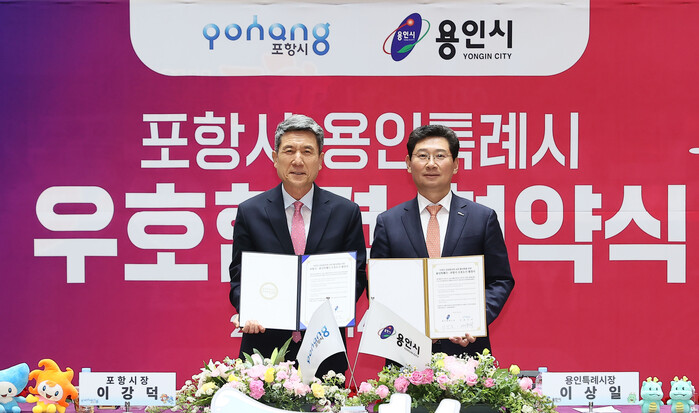 이상일 용인특례시장과 이강덕 포항시장은 이날 포항시청 대회의실에서 우호도시 교류 협약서에 서명했다.