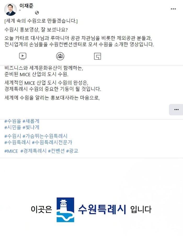 11일, 이재준 시장은 자신의 페이스북을 통해 “세계 속의 수원으로 만들겠습니다”라는 제목의 글을 올렸다.