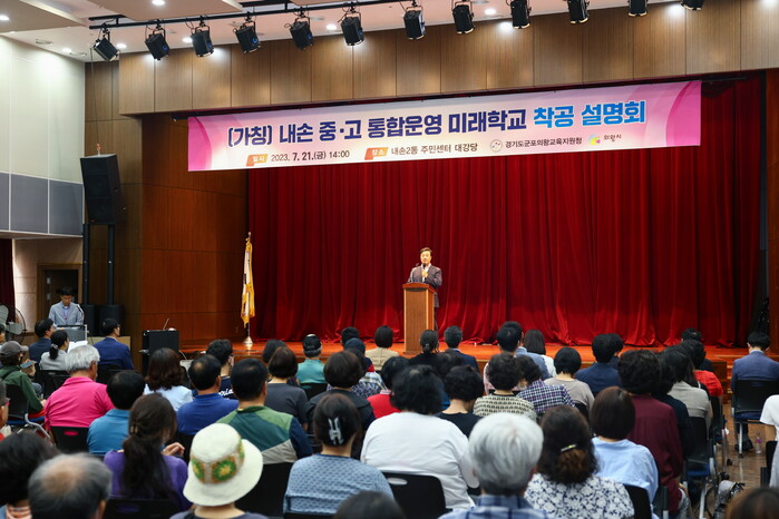 8경기도군포의왕교육지원청(교육장 이은광)과 의왕시(시장 김성제)는 21일 내손2동주민센터 대강당에서 학부모 및 시민들을 대상으로‘(가칭)내손 중.고 통합운영 미래학교 착공설명회’를 개최했다.