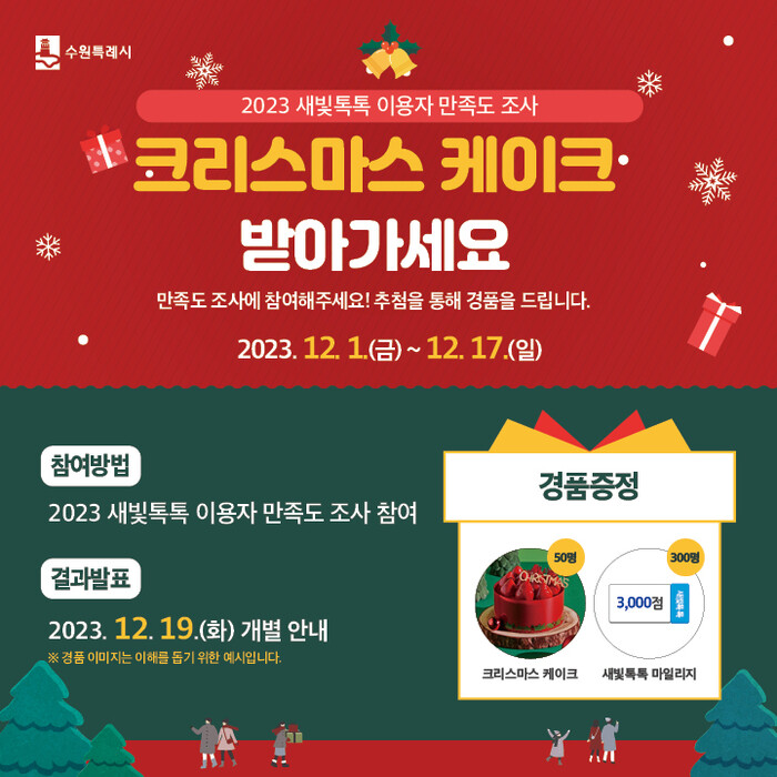 설문 참여자 중 총 350명을 추첨해 크리스마스 케이크 모바일 상품권(50명), 새빛톡톡 마일리지 3000점(300명)을 지급한다.