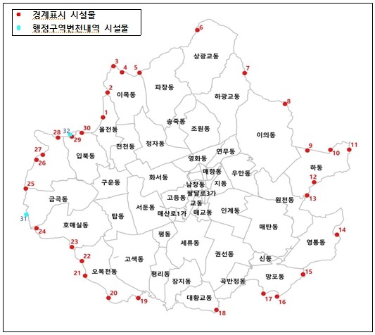 수원시 관계자는 “매년 경계시설물을 조사하고 정비해 시 경계에 대한 신뢰성을 확보하고 있다”며 “경계시설물을 철저히 조사해 시민들에게 정확한 경계 정보를 제공하겠다”고 밝혔다.