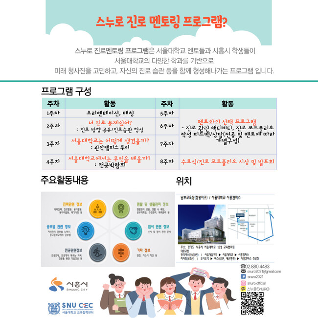올해 처음 시작한 대학진로 멘토링 <스누로(SNURO)>는 관내 중‧고등학생인 멘티(스누씨드)가 희망하는 학과의 서울대학교 학부생 멘토(스누링커)들과 함께 자신의 진로 설계를 위한 고민을 나누는 멘토링 프로그램이다.