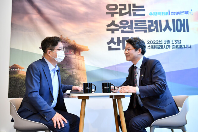 염태영 수원시장은 지난 12일 오후 7시40분 수원2049시민연구소가 주관한 ‘온라인 수원이야기-수요일엔 수원 공부’ 대담에 참여해 시민들에게 특례시에 대해 직접 설명하는 시간을 가졌다.
