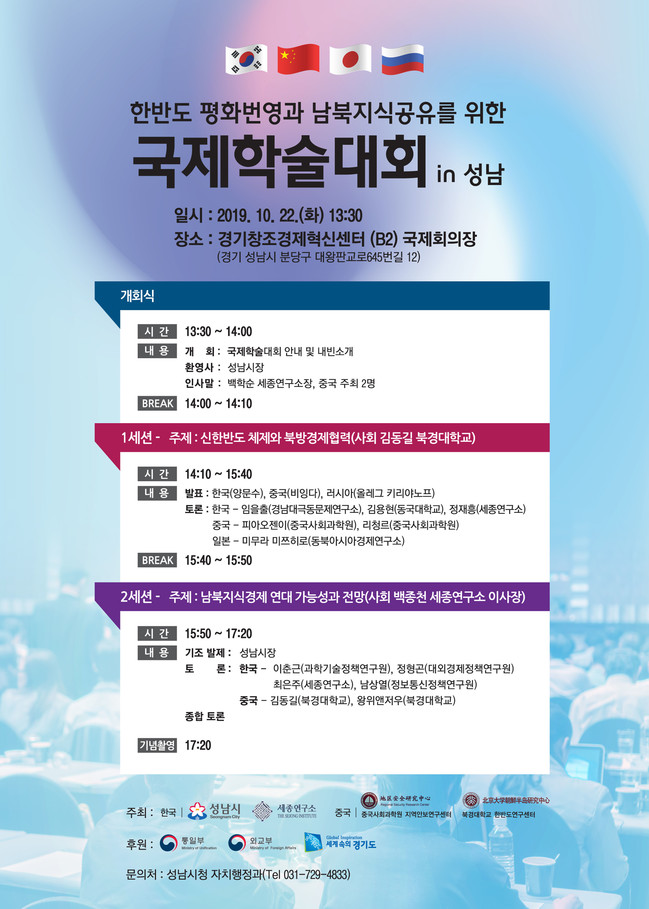 북방경제권 국가 간 협력 방안을 모색하고 남북교류 협력의 새로운 비전 제시를 위해 성남시와 세종연구소, 중국 사회과학원 지역안보연구센터, 북경대학교 한반도연구센터가 공동 주최해 마련하는 행사다.