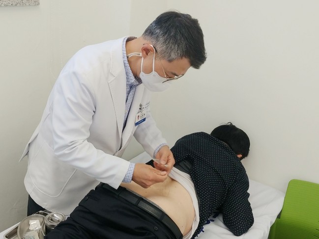 사진/잠실자생한방병원 신민식 병원장이 지역노인에게 침 치료를 실시하고 있다<자생한방병원 제공>