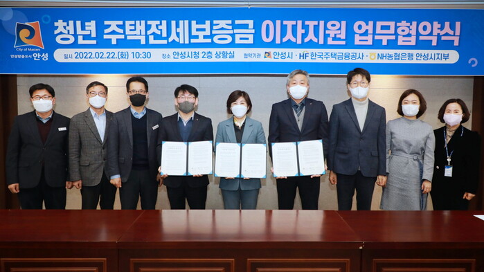 안성시는 지난 22일 안성시청 2층 상황실에서 한국주택금융공사(본부장 최상철) 및 NH농협은행 안성시지부(지부장 손남태)와 ‘안성시 청년 주택전세보증금 대출이자 지원사업 업무협약’을 체결했다.