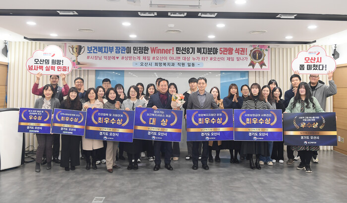 이번 평가에서 오산시는 ▲찾아가는 보건복지서비스 제공 부문 대상 ▲희망복지지원단 운영 부문 최우수상 ▲민관협력 및 자원연계 부문 최우수상 ▲사회보장급여 사후관리 부문 최우수상 ▲지자체 고독사 예방사업 우수사례 우수상을 차지했다.