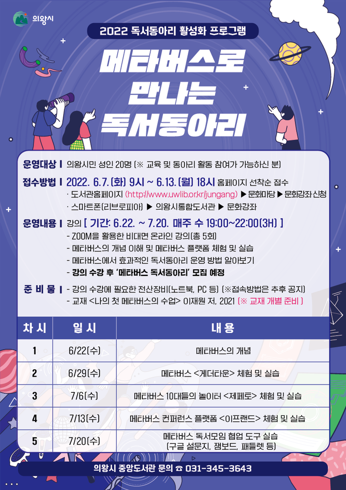 독서동아리 활성화 프로그램 ‘메타버스로 만나는 독서동아리’는 6월 22일부터 7월 20일까지 매주 수요일, 저녁 7시부터 10시까지 총 5회에 걸쳐 온라인 ZOOM으로 진행된다.