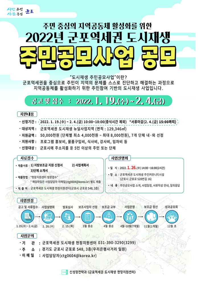 자세한 내용은 군포시 신성장전략과 도시재생팀(031-390-3290)으로 문의하면 안내받을 수 있다.