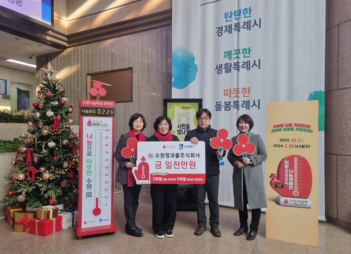 수원시 농수산물 도매시장에 있는 수원 청과물㈜이 22일 시청 로비 사랑의 온도탑 앞에서 “수원시 드림스타트 아동 난방비로 사용해달라”며 수원시 드림스타트에 후원금 1000만 원을 기부했다.