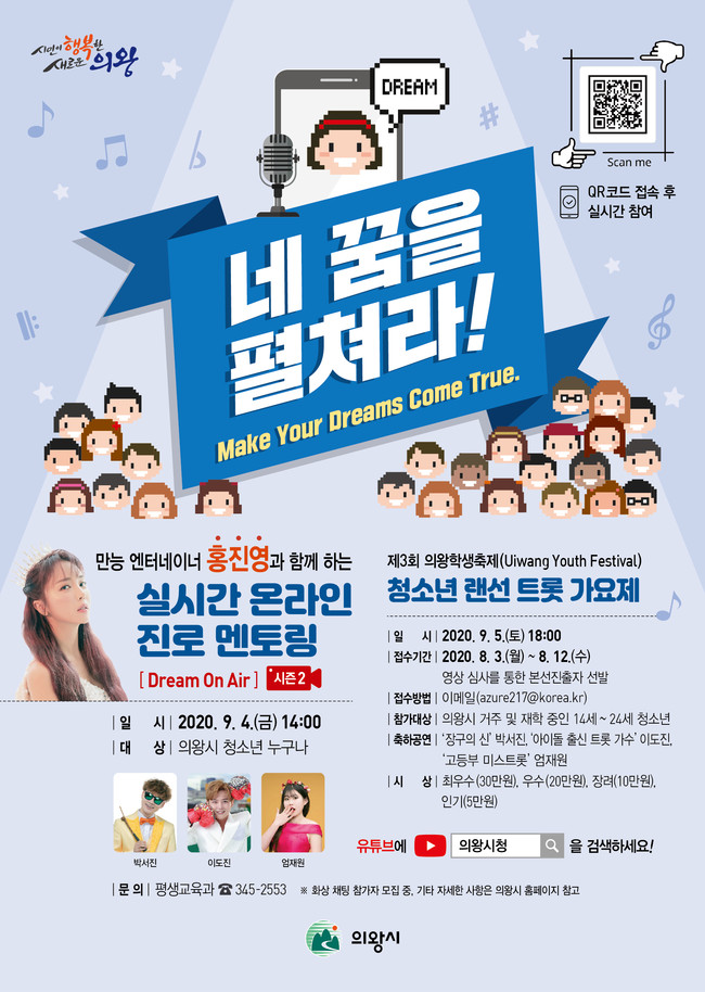 두 프로그램 모두 화상 시스템을 활용하여 실시간으로 소통 예정으로 각각 100명의 참가단 모집을 중이며‘Dream On Air’는 9. 4.(금) 14시, ‘청소년 랜선 트롯 가요제’는 9. 5.(토) 18시에 유튜브‘의왕시 채널’을 통해 라이브로 방송될 예정이다.
