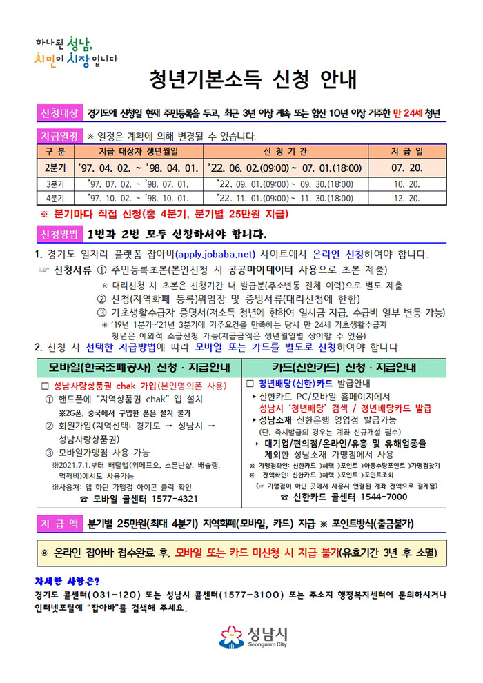성남시는 오는 7월 1일까지 올해 2분기 청년기본소득 지급 신청을 받는다.