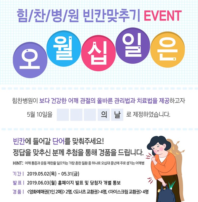 힘찬병원(대표원장 이수찬)이 올바른 어깨 관리의 필요성을 전달하고 대중의 인식을 개선하고자 올해 처음으로 5월 10일을 <힘찬병원 오십견의 날>로 정해 5월 2일(목)부터 31일(금)까지 ‘빈칸 맞추기 온라인 이벤트’를 진행한다고 밝혔다.
