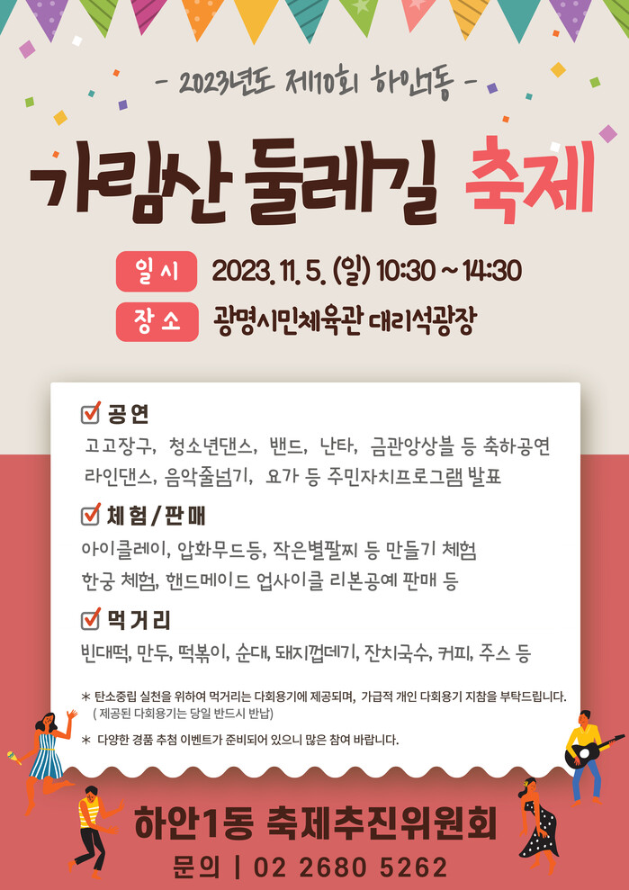 광명시 하안1동 축제추진위원회는 오는 5일 광명시민체육관 대리석 광장(우천시 오픈아트홀)에서 2023년도 ‘제10회 가림산둘레길축제’를 개최한다.