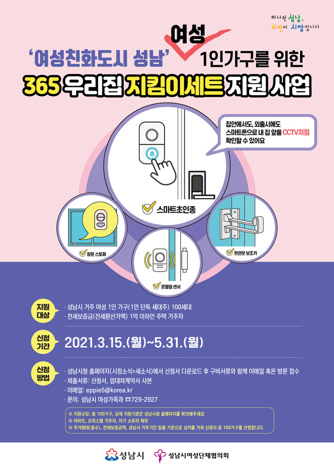 사진/성남시 여성 1인 가구 ‘365 우리 집 지킴이 4종 세트’ 지원 안내 포스터