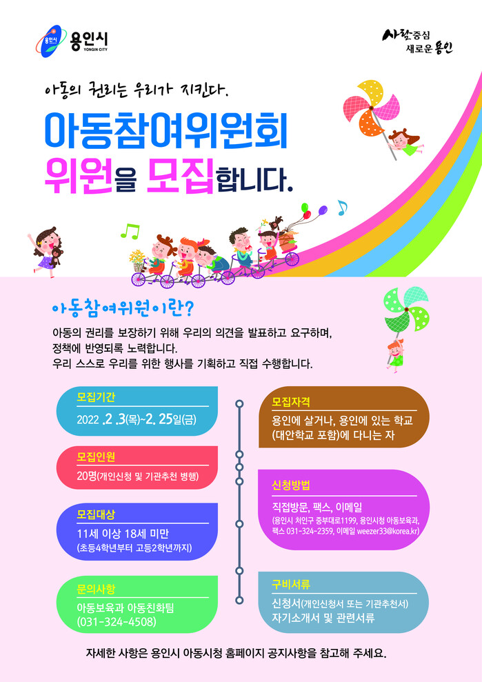 용인시가 3일부터 아동정책을 함께 만들어 나갈 ‘제4기 아동참여위원회’ 위원을 모집한다고 2일 밝혔다.