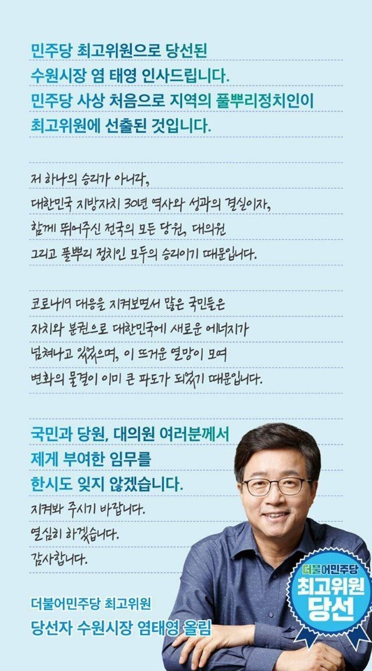 염태영 당선자는 “이번 당선은 나 하나의 승리가 아니라 대한민국 지방자치 30년의 결실이자, 함께 뛰어준 전국의 모든 당원, 대의원 그리고 풀뿌리 정치인 모두의 승리” 라며 당선 소감을 밝혔다.