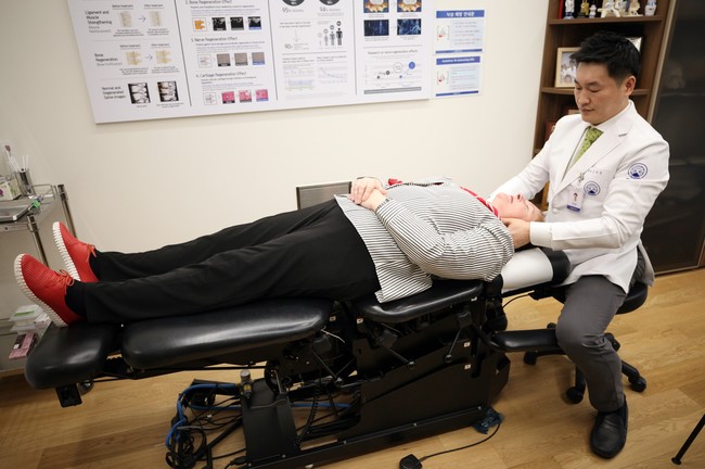 <사진/ 자생한방병원 김하늘 국제진료센터장이 추나요법을 시연하고 있다>