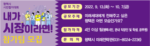 참가팀 모집은 2022년 10월 7일까지이며 시 홈페이지(고시공고)에서 서식을 다운받아 구비서류를 이메일, 우편, 방문 제출하면 된다. 자세한 사항은 평택시 미래전략관 시정협치팀(031-8024-2236)으로 연락하면 된다.