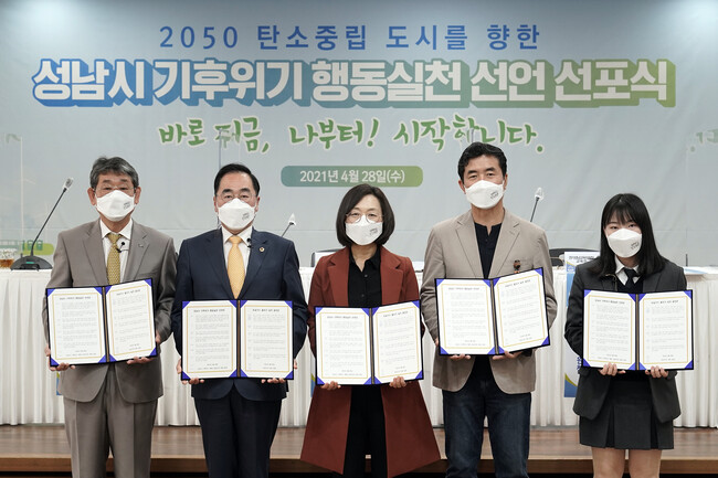 성남시(시장 은수미)는 4월 28일 오전 10시 30분 시청 한누리에서 2050년까지 탄소 중립 도시 만들기 위한 ‘기후 위기 행동실천 선언’ 온·오프라인 선포식을 했다.