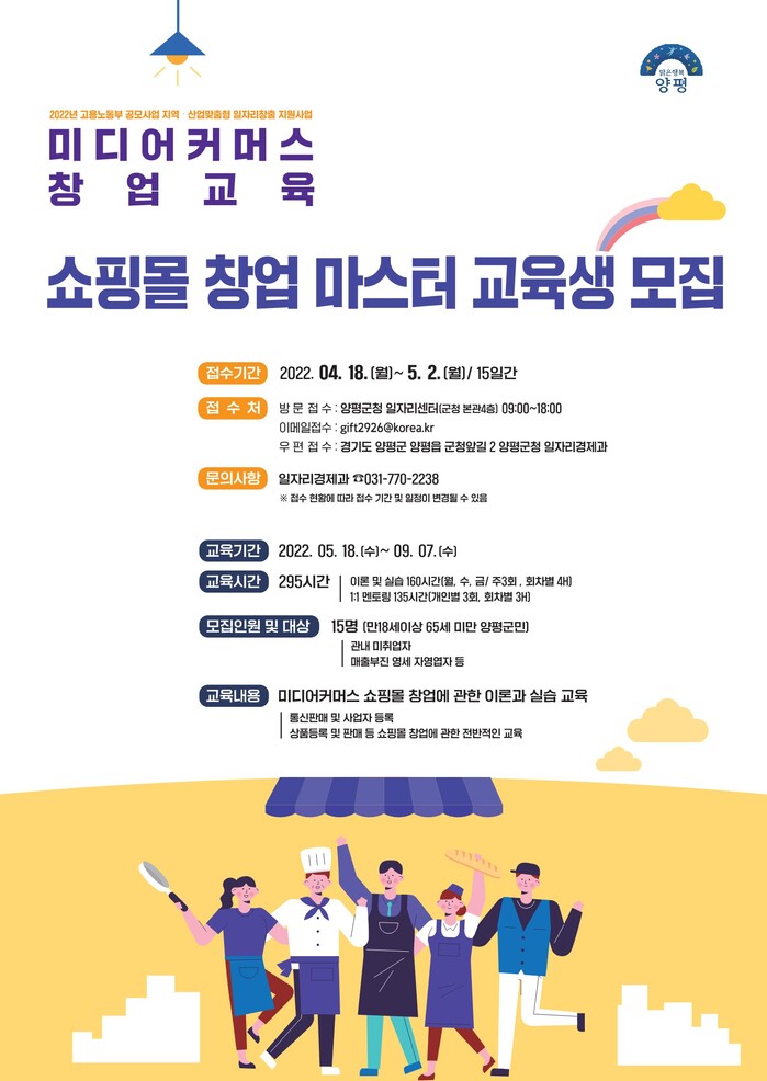 양평군(군수 정동균)은 2022년 고용노동부 공모사업인 지역맞춤형 일자리창출 지원사업 “미디어커머스 창업교육:「쇼핑몰 창업 마스터」”교육생을 2022.4.18(월)~5.2(월)까지 15일간 모집한다. 만 18세 이상~65세 미만의 양평 군민 중 미취업·미창업자 또는 영세 자영업자를 대상으로 진행하며, 모집 마감일 18시까지 양평군청 일자리센터 방문 또는 이메일(gift2926@korea.kr)로 접수 할 수 있다.