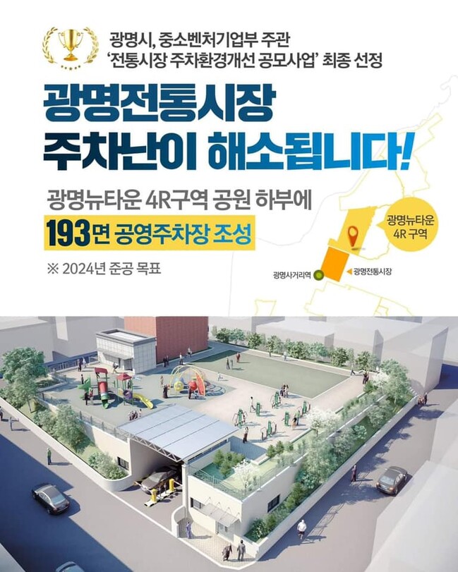 [로컬라이프] 광명시는 중소벤처기업부 '2022년 전통시장 주차환경개선사업' 공모에 선정되어 광명 전통시장에 193면 규모의 제2공영주차장을 조성한다고 밝혔다.