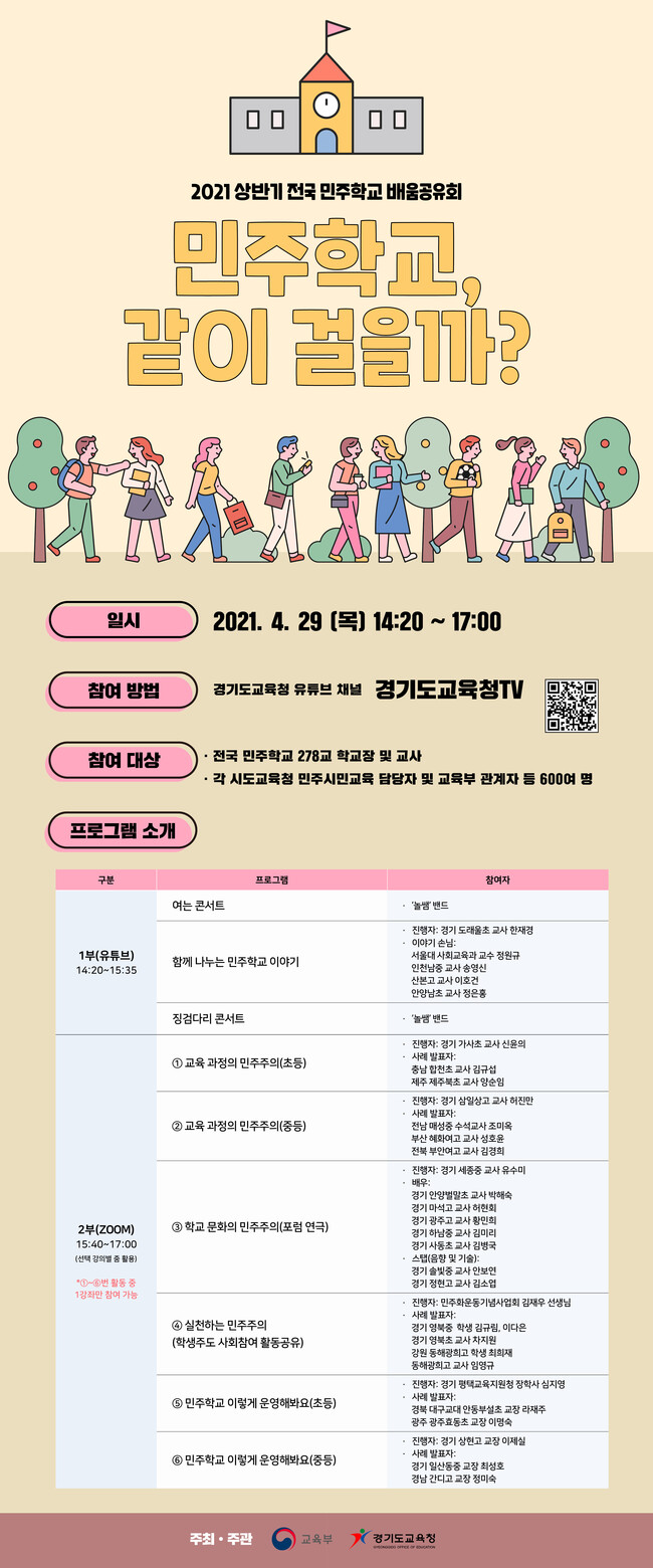 경기도교육청(교육감 이재정)이 ‘민주학교, 같이 걸을까’를 주제로 29일 원격으로 전국 민주학교가 만나는 자리를 마련한다.