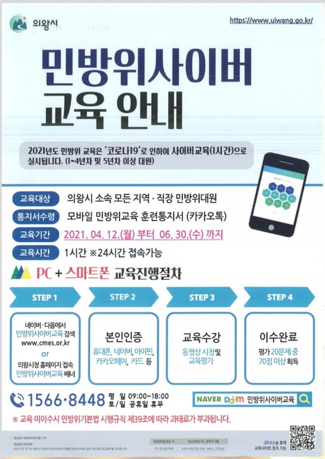 의왕시(시장 김상돈)는 올해 처음으로 민방위교육훈련 통지서를 모바일 전자고지방식과 병행해 통지하고, 오는 4월 12일부터‘2021년 민방위 사이버교육’을 실시한다고 밝혔다.