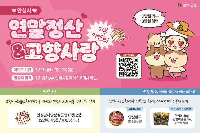 안성시(시장 김보라)가 연말정산 시즌에 맞춰 12월 1일부터 13일까지 ‘연말정산&고향사랑기부 선택이 아닌 필수 이벤트’를 진행한다.