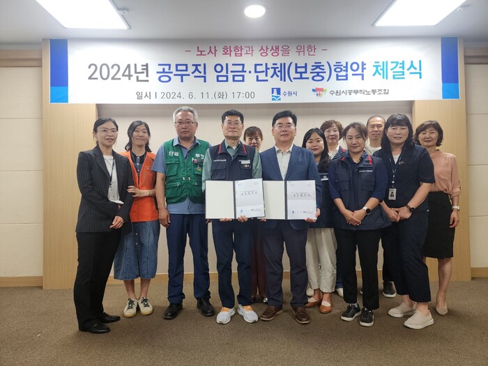 수원시(시장 이재준)와 수원시공무직노동조합은 11일 시청 귀빈실에서 ‘2024년 공무직 임금·단체(보충)협약’을 체결했다.