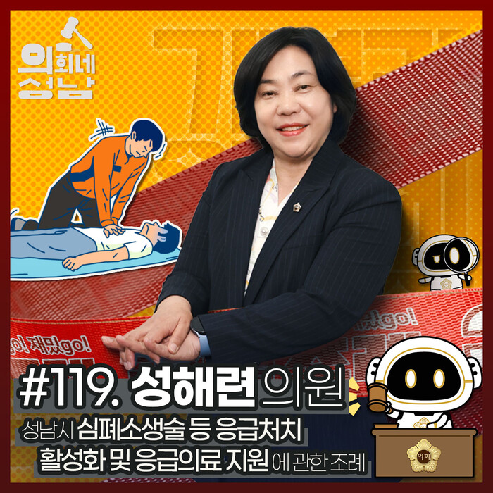 이번에 소개된 조례는 성해련 의원 등 18명이 발의한 ‘성남시 심폐소생술 등 응급처치 활성화 및 응급의료 지원에 관한 조례’다. 이 조례는 「응급의료에 관한 법률」에 따라 심폐소생술 등 응급처치 교육·홍보 및 응급의료 지원 등에 관한 사항을 규정함으로써 성남시민의 건강과 생명을 보호하고 응급사항에서의 대응역량 향상에 기여함을 목적으로 한다. 이번 조례로 신속하고 적절한 응급처치가 생명을 구하는 데 결정적인 역할을 한다는 인식을 시민들에게 널리 알리고, 응급처치 교육의 참여를 독려함으로써 전 시민이 응급상황에 대비할 수 있는 안전한 도시 환경 조성에 이바지할 것이라 기대하고 있다. 이 조례는 2023년 12월 11일부터 시행 중이다.