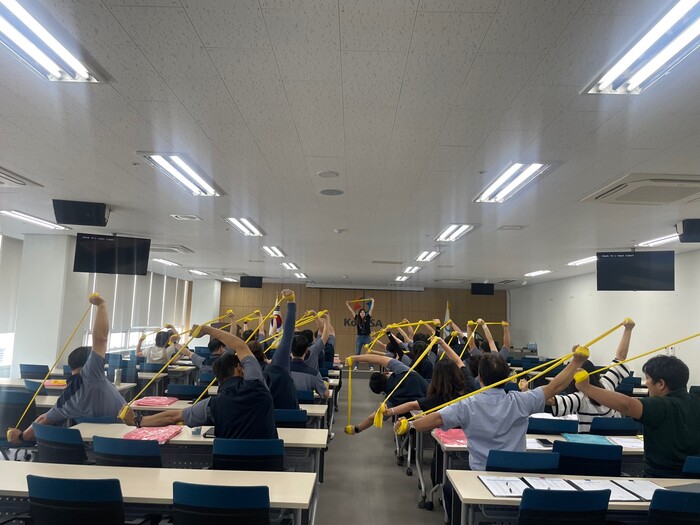 사진/근로자들이 세라밴드 스트레칭을 하고 있다.(사진제공=수원시)