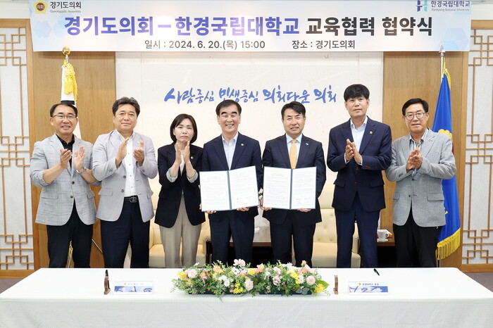 경기도의회(의장 염종현)가 20일 도내 유일의 국립대학교인 한경국립대학교와 협약을 체결하고 도의원과 의회사무처 직원의 교육 기회를 확대하기로 했다.