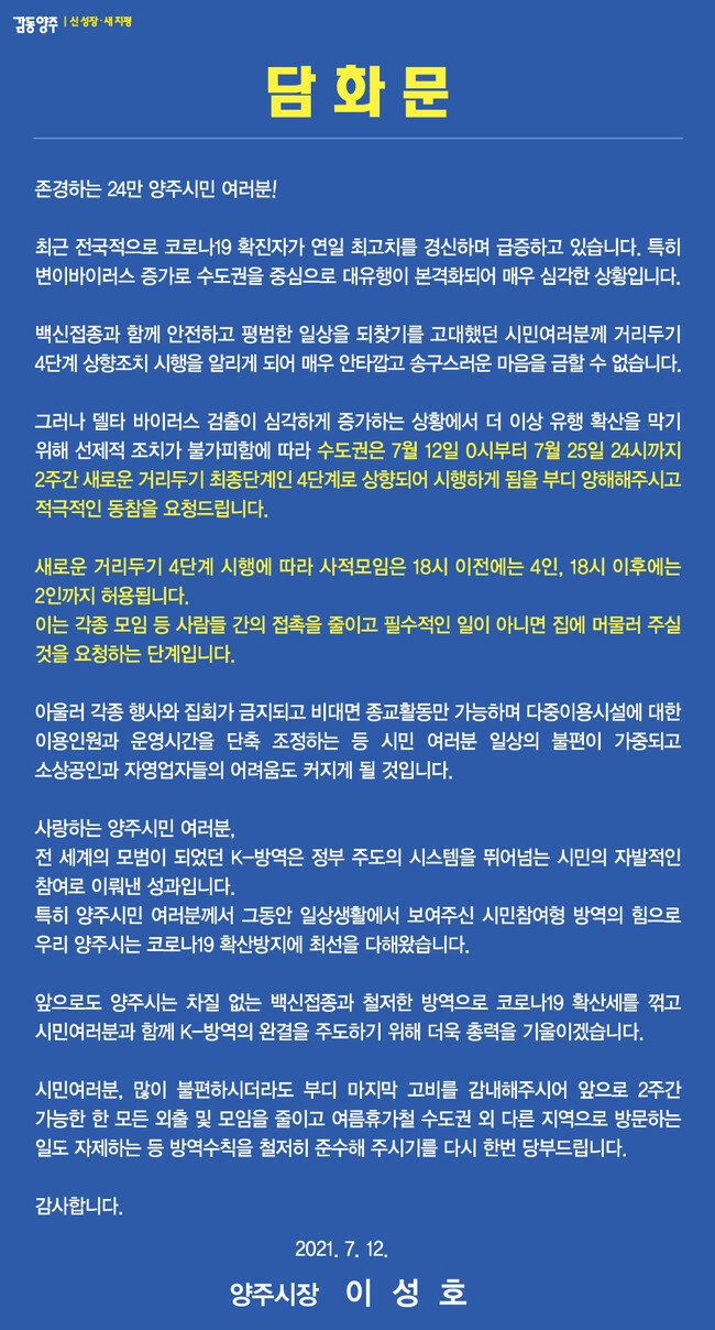 백신접종과 함께 안전하고 평범한 일상을 되찾기를 고대했던 시민여러분께 거리두기 4단계 상향조치 시행을 알리게 되어 매우 안타깝고 송구스러운 마음을 금할 수 없습니다.