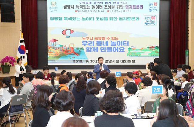 토론회 참여자들은 10개조로 나눠 △짜릿하고 재밌는 놀이터 △스릴 있는 놀이기구 놀이터 △높게 뱅글뱅글 출렁출렁 놀이터 △놀이터! 이런놀이터 처음이지! 자연과 함께하는 드림터 △F4놀이터(Fun, Free, Fine, Fantastic) △광명 자연 누리 놀이터 △우리 같이-가치 놀아요 △모두가 놀자 자연속에서 △오르고, 기고, 띠고 상상놀이터 △작은 놀이터의 색깔 있는 특성화 놀이터 등 주제를 정해 놀이터에 대해 다양한 의견을 나눴다.