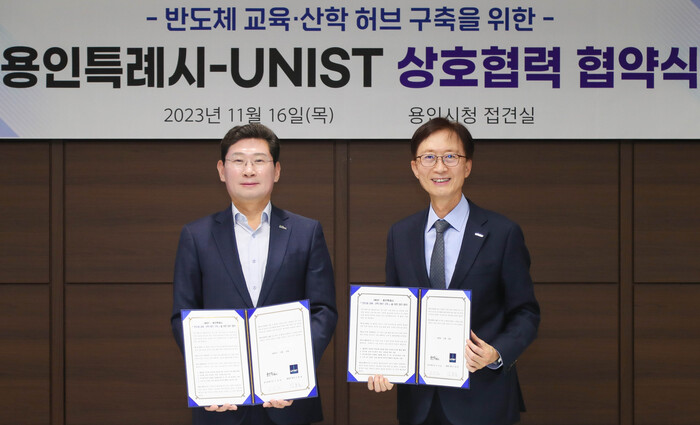 용인특례시와 UNIST는 16일 용인시청 시장 접견실에서 이상일 용인특례시장과 이용훈 UNIST 총장이 참석한 가운데 반도체 전문인력 양성과 산‧관‧학 네트워크 구축을 위한 업무 협약을 체결했다.