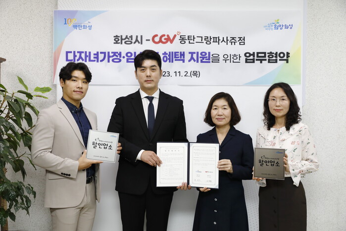 화성시(시장 정명근)가 다자녀가정 혜택을 더욱 확대하고자 2일 CGV동탄그랑파사쥬점(대표 이우람)과 지역 내 다자녀가정과 임산부에게 특별혜택을 제공하는 업무 협약을 맺었다.