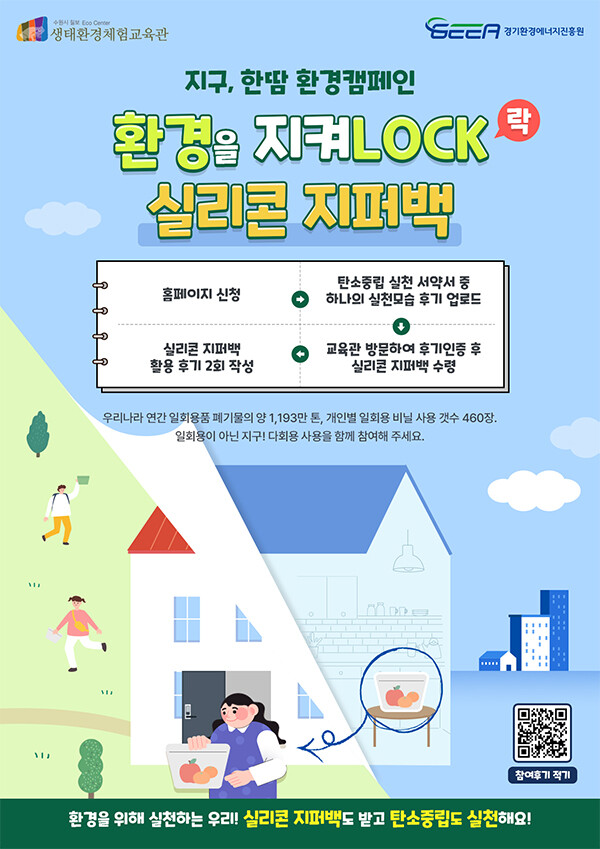 다회용품인 실리콘 지퍼백을 활용해 일회용 비닐의 낭비를 줄이는 캠페인이다. ‘2025년 도-기초 환경교육센터 간 공동협력사업’에 선정돼 추진하는 사업으로 수원시민은 누구나 참여할 수 있다.