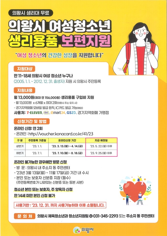 지원대상은 7월 1일 기준 의왕시에 주민등록이 되어 있는 11~18세(2005년1월1일~2012년12월31일 출생자) 여성청소년으로, 여성가족부에서 생리용품 바우처 지원을 받고 있는 대상자는 제외된다.