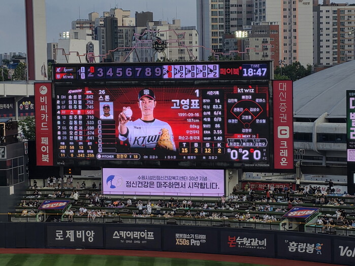 사진/수원KT위즈파크 전광판에 ‘정신건강은 마주하면서 시작합니다’ 메시지가 송출되고 있다.(사진제공=수원시)