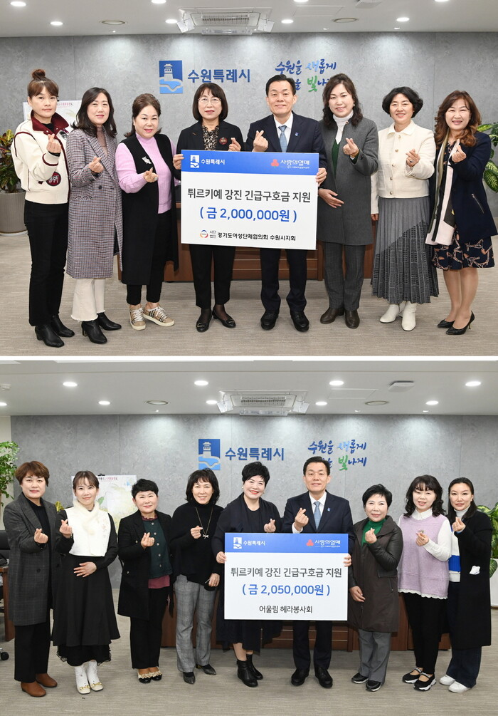 경기도여성단체협의회 수원시지회, 어울림 헤라봉사회가 “튀르키예·시리아 지진피해 복구 지원에 사용해 달라”며 수원시에 각각 200만 원, 205만 원을 기탁했다.