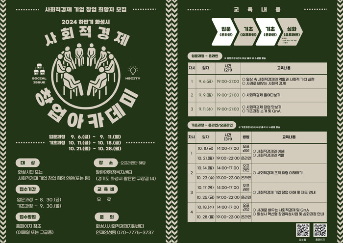 화성시(시장 정명근)가 2024년 하반기 화성시 사회적경제 창업아카데미 입문·창업 기초과정 수강생을 모집한다.