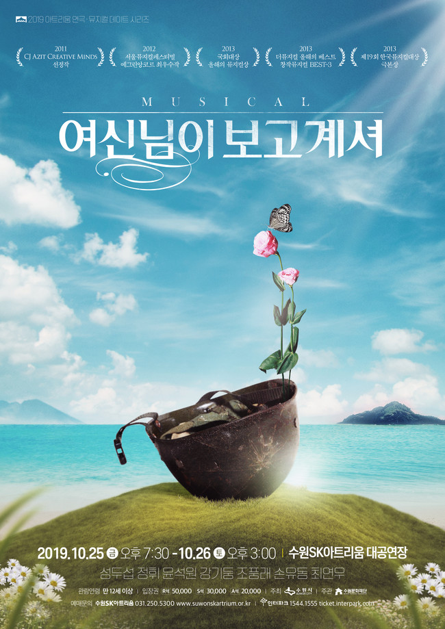 특히 이번 공연에는 탄탄한 연기력으로 인정받는 ‘믿고 보는 배우’들의 캐스팅으로 더욱 기대를 모으고 있다. 성두섭, 정휘, 윤석원, 강기둥, 조풍래, 손유동, 최연우가 출연하는 뮤지컬 <여신님이 보고 계셔>는 오는 10월 25일(금), 26일(토) 양일간 수원SK아트리움에서 관객들을 만날 예정이다.